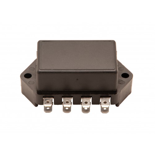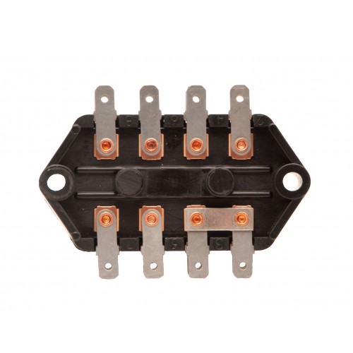 Pride 7FJ Fuse Box with clip on cover for four glass type fuses. There is provision to store two spare fuses, ready in case they are needed. Each end of each fuse has two 6.4 mm Lucar connections sideways from the Fuse Box, two of which are joined by a ‘common link’ underneath.